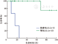 就总体治疗过程而言,在随访的18例患者中,大部分患者均接受以环孢素为主的治疗方案,有2例患者确诊时伴有骨髓纤维化,1例患者经过规律治疗5年后疾病稳定,而另外1例患者未行规律治疗8个月后因本病死亡。因此,对于惰性LGL患者,以环孢素为主的治疗方案疗效较好,而对伴有其他血液系统合并症的患者,应进行早期的治疗干预,争取患者的长期生存。1例侵袭性T-LGL和另外1例侵袭性NK细胞白血病的患者均在规律治疗24个月后因疾病进展死亡,而这2例患者由于年龄偏大,接受的治疗方案及强度较弱,均未给予目前推荐的ALL样方案治疗。但从总的病程来看,侵袭性LGL患者的预后明显差于惰性LGL。因此,对这部分年龄偏大、体质较弱的老年患者,如何选择一个最佳的治疗方案来获得长期生存,有待于进一步探讨。