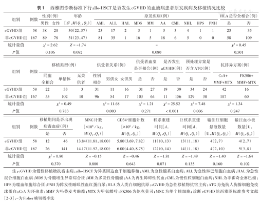 | 非cGVHD组 | 167 | 89 | 78 | 31(23,47) | 81 | 35 | 1 | 16 | 5 | 18 | 6 | 5 | 0 | 0 | 58 | 109 |
