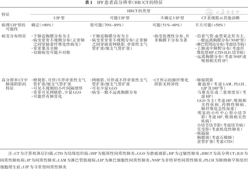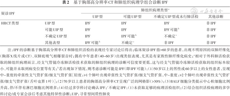 注:IPF的诊断基于胸部高分辨率CT和肺组织活检的表现经专家讨论后得出;临床疑诊IPF指>60岁的患者,出现不明原因的双肺纤维化(胸部X线片或CT)、双肺底吸气相爆裂音时;偶有中年患者(40~60岁)出现类似表现,尤其是有家族性肺纤维化病史;a相对于外科肺活检获取的肺组织病理而言,经支气管镜冷冻肺活检技术获取的肺组织病理的诊断可信度要更低,这与经支气管镜冷冻肺活检获取的组织标本较小、可能并未取到病变位置等有关;b若出现如下情况,则考虑诊断可能是IPF(即IPF可能):(1)50岁以上的男性或60岁以上的女性患者,呈现中~重度的牵张性支气管扩张/细支气管扩张[轻度:≥1个肺叶出现牵张性支气管扩张/细支气管扩张,中~重度:≥2个肺叶出现牵张性支气管扩张/细支气管扩张(舌叶也算1叶)];(2)70岁以上患者的胸部高分辨率CT呈现广泛的网格影(>30%);(3)BALF细胞分类提示中心粒细胞比例升高,伴/不伴有淋巴细胞比例增多;(4)经过多学科讨论确认IPF;c不确定IPF:(1)未获取足够的病理活检组织;(2)结合组织活检病理的多学科讨论/或专家会诊后考虑其他特异性诊断;UIP:寻常型间质性肺炎