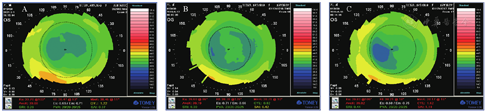 A:术前中央光学区偏中心切削;B:术后1 d中央光学区偏中心状态好转;C:术后2年