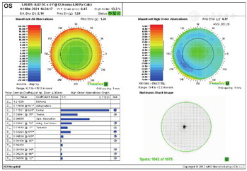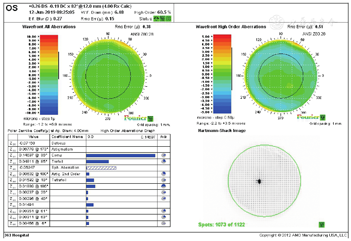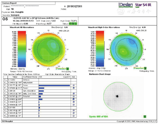 患者,女,19岁,因"左眼飞秒LASIK术后视力恢复欠佳6个月"于2019年6月10日至西南医科大学附属成都三六三医院就诊。患者6个月前曾在我院行双眼飞秒LASIK手术。术前检查:左眼主觉验光:-6.25-0.75×155;散瞳验光:-6.25-0.75×171;角膜曲率:44.50 D/45.75 D@91°;角膜厚度:600 μm,其余检查(包括裂隙灯显微镜眼前节检查、泪膜破裂时间、眼压、眼位、眼底检查)均无异常。手术设备:IntraLase FS型激光角膜手术仪(Intralase FS2,美国AMO公司)、Star S4 IR准分子激光角膜屈光治疗机(VISX S4IR,美国AMO公司),手术参数:能量密度为160 mJ/cm2,传输率为26.5%,拟矫度数为-6.65-0.65×165,角膜瓣直径8.5 mm,切削直径8 mm,光学区直径6.5 mm,过渡区1.5 mm,总切削深度104 μm。术后1d、1周、1个月3次复查均显示左眼裸眼视力(UCVA)及矫正视力欠佳,角膜地形图显示有偏中心切削,患者自觉左眼视物模糊、眩光、夜视力下降,已严重影响其生活质量,要求再次手术。患者2019年6月10日检查结果如下:UCVA:右眼1.0+,左眼0.4-;屈光度:右眼0.00 D,左眼0.00 D;右眼其余检查无异常。左眼主觉验光:+1.00-0.75×35,矫正视力0.6,左眼角膜厚度:496 μm;角膜地形图提示左眼光学区偏中心切削,角膜表面非对称性指数(Surface asymmetry index,SAI):1.18,角膜表面规则性指数(Surface regularity index,SRI):0.44(见图1A),左眼OrbscanII提示角膜最薄点后表面高度值正常,排除圆锥角膜,左眼波前像差仪检查结果见图2。多次复查波前像差后选择重复性最好、屈光状态与主觉验光相吻合的检查结果作为手术设计方案,由于波前设计方案中显示光学区直径为6.0 mm,过渡区3.0 mm,总切削范围达9.0 mm,大于初次手术的角膜瓣直径8.5 mm,故我们将光学区直径修正为5.5 mm。裂隙灯显微镜检查:双眼角膜中央透明,角膜瓣边缘可见,根蒂位于上方。诊断:左眼飞秒LASIK术后偏心切削。治疗采用波前像差引导的LASIK增效手术。术中采用掀开原角膜瓣法,掀瓣后将事先储存的设计方案调出(波前屈光度数+0.56-0.87×23,切削区直径5.5 mm,过渡区3.0 mm,最大切削深度20 μm),虹膜定位,行个性化准分子激光切削。