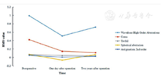 The total high order aberrations and coma were slightly changed compared with the one day after operation, but they were still lower than those before operation.
