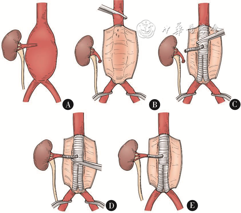 肾上AAA是指至少累及一侧肾动脉甚至肠系膜上动脉,但不累及腹腔干的AAA。手术入路的选择与IV型胸腹主动脉瘤相似,需要胸腹联合切口,腹膜后入路。患者右侧卧位,切口经第10肋间腋后线起到腹直肌外侧缘,并向下延伸至脐下。切开腹外斜肌、腹内斜肌、腹横肌,钝性分离膈肌以及将后腹膜与腹壁分开,注意不要侵入腹腔。由于需要膈下阻断腹主动脉,而内脏耐受缺血时间较短,因此应尽可能缩短腹主动脉内脏动脉区阻断时间。膈下阻断腹主动脉、双侧髂动脉和各内脏动脉后,纵行切开腹主动脉至近端瘤颈形成“T”形切口,在动脉瘤腔内壁辨认腹腔干、肠系膜上动脉和右肾动脉开口。取涤纶分叉型人工血管,另取一支涤纶管型人工血管(直径与左肾动脉匹配)与分叉型人工血管主体远端侧面作端侧吻合,分叉型人工血管主体近端修剪成斜面备用。分叉型人工血管主体近端斜面与近端瘤颈吻合时覆盖腹腔干、肠系膜上动脉和右肾动脉开口。吻合时用聚丙烯缝线作连续缝合。近端吻合口完成后,阻断人工血管主体远端,解除膈下主动脉阻断,随之腹腔干、肠系膜上动脉和右肾动脉血流得以恢复。然后修剪管型人工血管与左肾动脉作端端吻合,至此左肾动脉血流也得以恢复。吻合完成后,阻断钳移至分叉型人工血管双侧髂支,最后完成与双侧髂动脉的吻合(图1)。