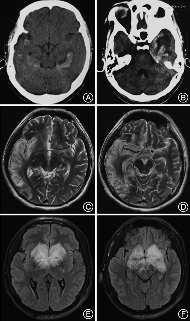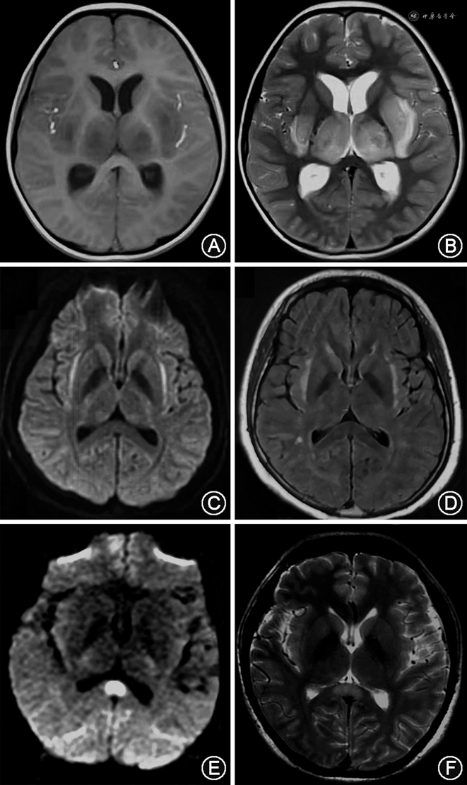 3.流行性乙型脑炎:简称乙脑,又称日本脑炎,乙脑病毒属于单正链RNA病毒、黄病毒属。人与多种牲畜、禽鸟类均可感染乙脑病毒,猪是乙脑病毒的主要传染源,经蚊虫叮咬传播。乙脑累及整个CNS的灰质,以基底核、丘脑和大脑皮质最严重,脊髓灰质也可受累。本病主要出现于夏、秋季,轻症患者表现为脑膜炎或者单纯的精神行为异常;重症者以抽搐、意识障碍、呼吸衰竭为主要表现;累及脊髓灰质者,可表现为急性弛缓性麻痹,出现1个或多个肢体瘫痪,下肢较上肢明显。近年我国西北地区乙脑以成人和老年患者为主,且可引起吉兰-巴雷综合征样表现,包括急性运动轴索性神经病和急性感觉运动轴索性神经病[15]。患者的脑脊液白细胞计数多在50×106/L~500×106/L,早期以中性粒细胞为主,后逐渐转变为淋巴细胞为主的炎症。头颅MRI显示双侧丘脑、基底节、脑干受累,有或无异常强化,有时也可见小脑、脊髓和大脑皮质异常信号,部分患者头颅MRI正常(图1)。确诊实验首选抗乙脑病毒抗体(IgM)检测;脑脊液或血液PCR检测乙脑病毒核酸阳性可以确诊。