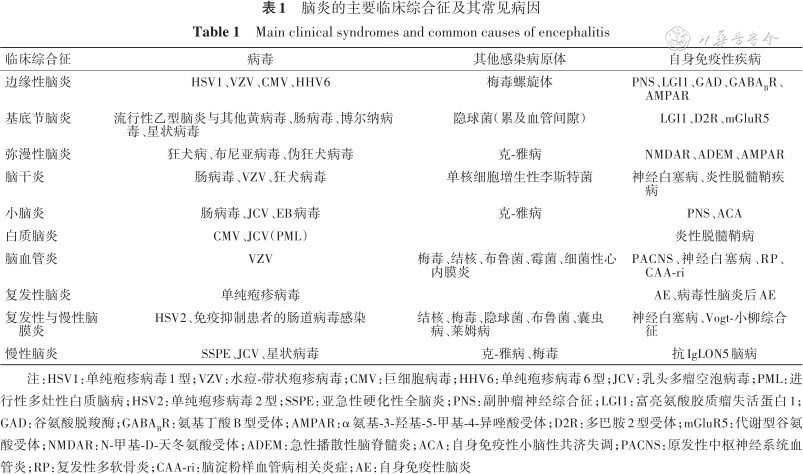注:HSV1:单纯疱疹病毒1型;VZV:水痘-带状疱疹病毒;CMV:巨细胞病毒;HHV6:单纯疱疹病毒6型;JCV:乳头多瘤空泡病毒;PML:进行性多灶性白质脑病;HSV2:单纯疱疹病毒2型;SSPE:亚急性硬化性全脑炎;PNS:副肿瘤神经综合征;LGI1:富亮氨酸胶质瘤失活蛋白1;GAD:谷氨酸脱羧酶;GABABR:氨基丁酸B型受体;AMPAR:α氨基-3-羟基-5-甲基-4-异唑酸受体;D2R:多巴胺2型受体;mGluR5:代谢型谷氨酸受体;NMDAR:N-甲基-D-天冬氨酸受体;ADEM:急性播散性脑脊髓炎;ACA:自身免疫性小脑性共济失调;PACNS:原发性中枢神经系统血管炎;RP:复发性多软骨炎;CAA-ri:脑淀粉样血管病相关炎症;AE:自身免疫性脑炎
