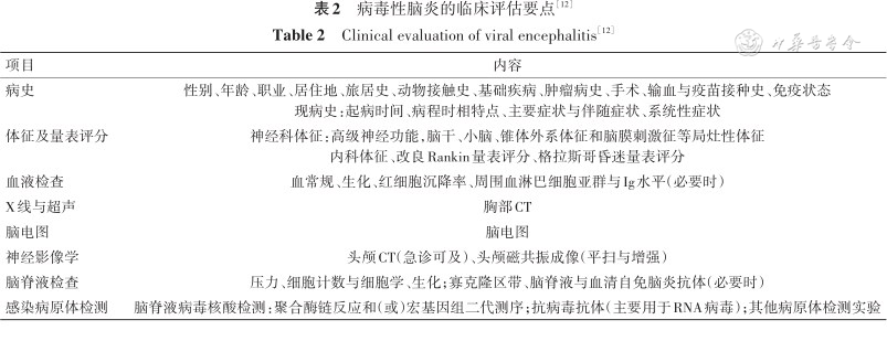 3.诊断流程:病毒性脑炎的诊断需要综合分析患者的临床表现、脑脊液检查、神经影像学和脑电图检查等结果,首先确定其患有脑炎,继而通过病毒核酸检测等病毒鉴定实验方可确诊(表2)[12]。
