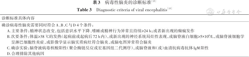 4.诊断标准:(急性)病毒性脑炎的确诊需要同时满足主要条件、次要条件、确诊实验、排除其他病因共4个条件,具体内容详见表3[13]。
