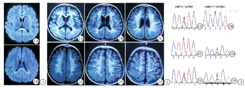 患儿 男,4岁半,第1胎。2岁前生长发育正常,2岁时无明显诱因出现进行性抬头不稳,头略后仰,翻身不能,拉起反射阳性,双侧膝腱反射活跃,双侧巴宾斯基征阳性,四肢肌张力高。头部磁共振成像(MRI)平扫可见胼胝体压部及双侧侧脑室后角旁白质区对称分布片状异常信号,为T1WI呈稍低信号,T2WI级压水压脂像呈稍高信号(图1)。双侧额、颞叶脑沟略增宽。提示髓鞘发育不良。临床诊断为脑白质发育不良,于我院康复科规律康复治疗。4岁时无明显诱因出现抽搐,发作表现为双眼上翻,凝视,口周发绀,四肢僵直,意识丧失。视频脑电检测可见背景弥漫性慢波,清醒期前头部偶见棘波散发。抽搐发生后立即就诊于我院,复查头部MRI可见双侧侧脑室旁白质区见对称性大片异常信号,T1WI呈稍低信号,T2WI级压水压脂像呈稍高信号(图2)。胼胝体体积变小,部分脑沟增宽。2个月前时患儿复查未出现其他系统异常表现,检测外周血白细胞芳香基硫酸酯酶A(arylsulfatase,ARSA)活性结果为32.6nmol/mg.17h(正常参考值217~360 nmol/mg.17h)。明确诊断为晚婴型异染性脑白质营养不良(metachromatic leukodystrophy,MLD)。父母体健,非近亲婚配,否认癫痫及遗传病家族史。其母现孕15周,于本中心行遗传咨询及产前诊断。