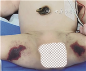 2.诊疗经过:入院后考虑患儿存在败血症及DIC,静脉应用哌拉西林他唑巴坦抗感染,FFP输注2 d停用,血小板有所上升。入院第5天患儿出现发热、贫血貌、右上臂皮肤瘀斑,血压升高,Hb及PLT降低,升级为美罗培南、万古霉素抗感染,有创辅助通气,继续纠正贫血、每天输注FFP,应用肝素及降血压治疗,病情有所改善,改无创呼吸机辅助通气。入院第10天患儿出现双侧腹股沟及右前臂瘀斑,予完善蛋白C、蛋白S检测,继续输注FFP。入院第14天患儿出现精神反应差,贫血貌、囟门张力增高,Hb、PLT下降,血不凝集,超声提示颅内出血加重,门静脉矢状部、髂静脉出现血栓。入院第16天回报蛋白C活性<10%(发色底物法,参考值60%~140%),蛋白S活性62.2%(凝固法,参考值63.5%~149%),予每天输注FFP 2次,患儿病情逐渐好转,皮肤紫癜瘀斑逐渐结痂脱落,入院30 d复查头颅MRI提示双侧大脑实质出血(亚急性期),幕上脑室扩张显著,眼底检查提示白曈、瞳孔不规则、晶体混浊、视网膜剥离,提示双眼视力丧失。入院41 d基因回报PROC基因存在一组复合杂合变异,符合遗传性PCD诊断。住院6周患儿家长放弃治疗离院。患儿生后2月余电话随访,离院后未行特殊治疗,皮肤无新出紫癜,无抽搐表现,后失访。患儿暴发性紫癜表现见图1。