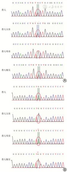 3.基因分析:取患儿及其父母、胞兄外周血进行全外显子基因组检测,结果见图2,提示PROC基因存在一组复合杂合变异,一处为c.314G>T,导致氨基酸改变p.C105F(半胱氨酸>苯丙氨酸);另一处c.1218G>A,导致氨基酸改变p.M406I(甲硫氨酸>异亮氨酸)。经Sanger测序验证,患儿父亲携带单杂合变异c.314G>T,母亲携带单杂合变异c.1218G>A,兄长携带单杂合变异c.314G>T。家系验证结果符合常染色体隐性遗传,与遗传性PCD的遗传模式吻合。