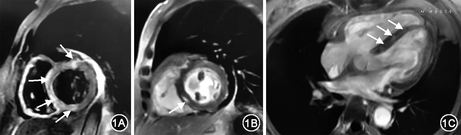 入院体格检查:体温36.2 ℃,心率103 次/min,呼吸20 次/min,血压100/69 mmHg(1 mmHg=0.133 kPa),神清,双侧眼睑下垂,左侧明显。双肺呼吸音清,未闻及干湿啰音。心律齐整,各瓣膜听诊区未闻及病理性杂音。腹部皮肤见手术瘢痕,双下肢无水肿,双下肢肌力4+级。实验室检查(2021-08-05):cTnI 2.200 mg/L,CK-MB 595 U/L,CK 20 313 U/L,NT-proBNP 6 580 ng/ml,ALT 950 U/L,AST 1 176 U/L,凝血功能、血沉、甲状腺功能、肝炎系列抗体未见明显异常,肌炎相关自身抗体(抗ANA抗体、抗ScL-70抗体、抗PM-ScL抗体、抗SSA抗体、抗SSB抗体)阴性,肌炎特异性自身抗体(抗Jo-1抗体)阴性。胸部CT:双肺散在渗出,心脏增大。肌电图:双侧尺神经、左侧腋神经、双侧副神经、双侧面神经低频(3 Hz)重复电刺激试验阴性,右侧腋神经低频(3 Hz)重复电刺激试验可疑阳性,左侧三角肌肌电图未见明显异常。超声心动图:心脏结构未见明显异常,室壁运动普遍减低,左心室射血分数(LVEF)34%。心脏磁共振(图1):左心室室间隔及毗邻前壁、下壁心肌组织T2压脂序列信号增强,考虑心肌水肿;左心室室间隔及毗邻前壁肌壁间见条片状及斑片状延迟强化。结合病史特点,且近期有PD-1抑制剂使用史,考虑“药物性心肌炎:免疫检查点抑制剂(immune checkpoint inhibitors,ICI)相关心肌炎可能性大”。