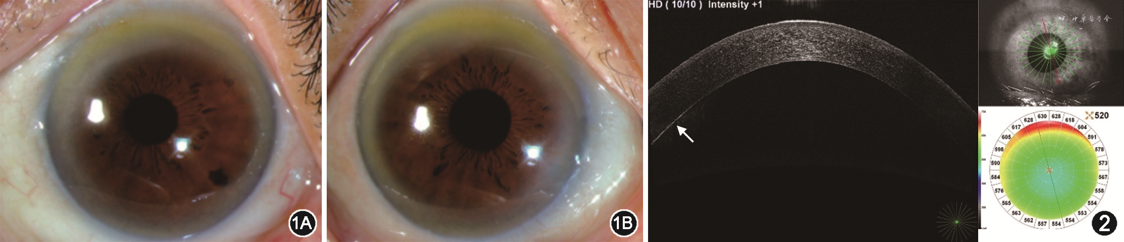 采用裂隙灯检查法观察肝豆状核变性患者双眼前节,可见双眼角膜缘处宽约2 mm黄绿色圆环,上方明显,为角膜Kayser-Fleischer环 1A示右眼;2B示左眼 精粹图片2 采用眼前节相干光层析成像术检查肝豆状核变性患者角膜,可见角膜后弹力层铜沉积,形成高反光条带(箭头),其余角膜各层次结构未见明显异常(右侧上下图示扫描位置)