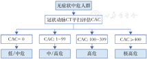 对40~80岁无症状中危人群推荐行冠状动脉CT检测CAC评分,以对此类人群进行风险再分类(图2),这组人群如果筛查到冠状动脉钙化斑块一般不推荐进行下游检查。对于CAC=0的个体,可每隔5年重复CAC扫描;CAC>0的个体,可每隔3~5年重复CAC扫描。应用B超对颈动脉斑块筛查作为风险增强因子是合理的(图1)。对于特定个体,若CAC评分与基于颈动脉斑块的危险分层结果不一致时,以危险分层等级高者为准。