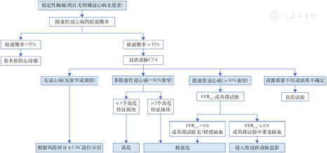 本共识推荐冠状动脉CTA作为PTP中高概率(≥15%)的稳定性胸痛患者起始筛查方法,原因如下:(1)诊断价值相对偏高的负荷试验技术,如负荷超声心电图、负荷核素心肌灌注显像及负荷心脏磁共振在国内大多数医院不能常规开展;运动负荷心电图能够常规开展但敏感性偏低; (2)负荷试验阴性仅能排除有血流动力学意义的狭窄病变,不能对有无斑块及斑块的部位、性质和狭窄程度做出准确判断;(3)负荷试验阴性会让部分医师和患者误认为风险为低危而降低治疗的强度或依从性;(4)负荷试验不能排除非动脉粥样硬化斑块,如心肌桥、心肌肥厚等原因引起的假阳性; (5)冠状动脉CTA有较高的阴性预测价值;(6)冠状动脉CTA不但能测量管腔狭窄程度,还能识别高危斑块(正性重构、低衰减斑块、点状钙化与餐巾环征)及对冠状动脉的生理学信息[CT冠状动脉血流储备分数(fractional flow reserve,FFRCT)]进行"一站式"评估;(7)冠状动脉CTA获得的斑块信息,包括部位、性质和狭窄程度,可用于危险分层和指导下一步治疗;(8)冠状动脉CTA获得的斑块直观图像可提高患者对预防性治疗措施的依从性;(9)冠状动脉CTA可识别非动脉粥样硬化斑块因素引起的相关症状;(10)冠状动脉CTA能够显著减少需要ICA的比例,可以作为ICA的"看门人" 。