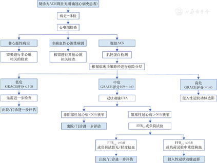 注:本流程不适用于疑诊为急性肺栓塞、急性主动脉综合征、急性心包炎和气胸等引起的急性胸痛;负荷试验包括负荷超声心动图、负荷心脏磁共振、负荷单光子发射计算机体层摄影(SPECT)/正电子发射计算机断层扫描(PET)及负荷心电图。 ACS,急性冠状动脉综合征;FFRCT,CT冠状动脉血流储备分数
