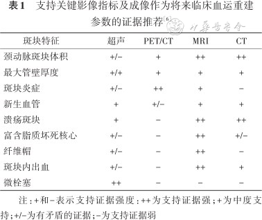 病理上的高危斑块是指那些具有较大的脂质核心、纤维帽破裂、斑块内出血等特征的斑块。与之相对应,影像上的高危斑块是指与心脑血管事件相关的斑块,目前临床上常用的主要评价指标包括斑块体积、最大管壁厚度、斑块内新生血管、斑块形态(表面不规则)、斑块成分(大脂质核心和薄纤维帽、斑块内出血)等。目前针对颈动脉和颅内动脉斑块的评估,高分辨磁共振血管壁成像的研究较多,然而各个研究又存在一些异质性,如成像的参数、扫描的序列、覆盖的范围等。近年来,国内外的磁共振放射学组针对血管壁成像扫描的一些规范也进行了推荐[4, 5],国际颈动脉斑块专家组针对用于识别颈动脉斑块易损性的影像方法进行了梳理和推荐(表1)[6],为今后开展更高质量的卒中干预研究奠定了基础。