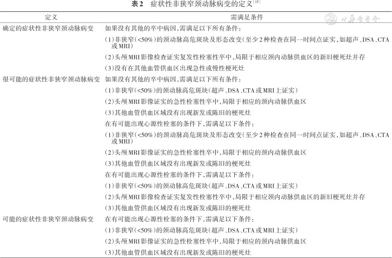 | 确定的症状性非狭窄颈动脉病变 | 如果没有其他的卒中病因,需满足以下所有条件: |
