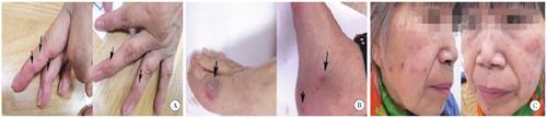 2020年8月14日患者就诊时诉皮肤近来出现多发痛性结节,分布于双手掌侧、指侧(图1A),伴关节疼痛反复,考虑不除外病情活动所致,遂先后调整依那西普为托法替布、妥珠单抗,但患者关节疼痛和结节疼痛改善均不明显。2020年12月15日,调整方案为甲氨蝶呤10 mg每周1次,阿达木单抗40 mg每2周1次,患者关节肿痛症状缓解,但皮肤痛性结节未见缓解,并进行性加重,同时蔓延至颜面部、足部、四肢及胸背部(图1B,图1C)。因结节与患者关节症状并不平行,所以我们怀疑该结节可能与甲氨蝶呤相关。因此,于2021年1月26日,我们停用甲氨蝶呤,调整方案为来氟米特10 mg/d,继续阿达木单抗40 mg每2周1次,患者痛性结节缓解,但关节肿痛症状加重。为进一步证实该结节与甲氨蝶呤存在相关性,2021年2月9日,与患者沟通后再次调整方案为甲氨蝶呤联合阿达木单抗治疗,关节肿痛逐渐缓解,但痛性结节加重。进一步行结节病理活检:皮肤组织,真表皮交界处少量空泡变性细胞,真皮全层间质大量黏液变性,浅中层血管周围淋巴细胞浸润,可见噬黑素细胞。至此,我们考虑该患者的痛性结节为甲氨蝶呤结节(methotrexate nodulosis)。