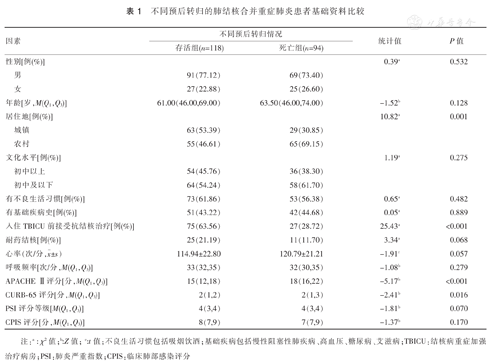 不同预后转归的肺结核合并重症肺炎患者基础资料比较