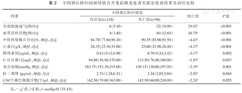 两组患者在中性粒细胞百分比、白蛋白、降钙素原、氧合指数、D-二聚体、CD4+T淋巴细胞计数、有创机械通气、需使用血管活性药物方面比较差异有统计学意义(P均<0.05),具体结果见表2。