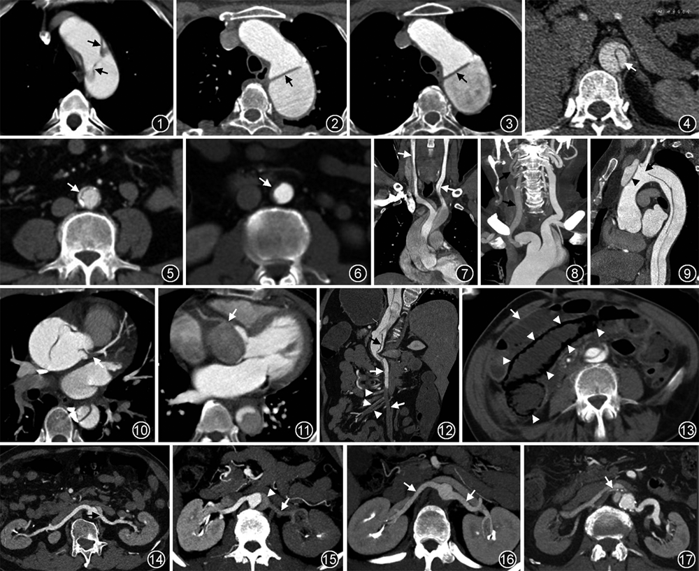 基于急性AD病理改变的多样性和复杂性,以及从急诊接诊开始的高标准临床需求,常规的CTA诊断报告提供的信息已经不能与时俱进地适应当今临床对AD的诊断、治疗及随访等各个方面的进展与需求。因此,有必要更加规范、全面地解读AD的CTA征象,并深入理解征象对AD的诊断、风险分层、治疗决策、不良预后等的临床价值和意义[7,10, 11],更好地指导临床高效诊断和精准决策。
