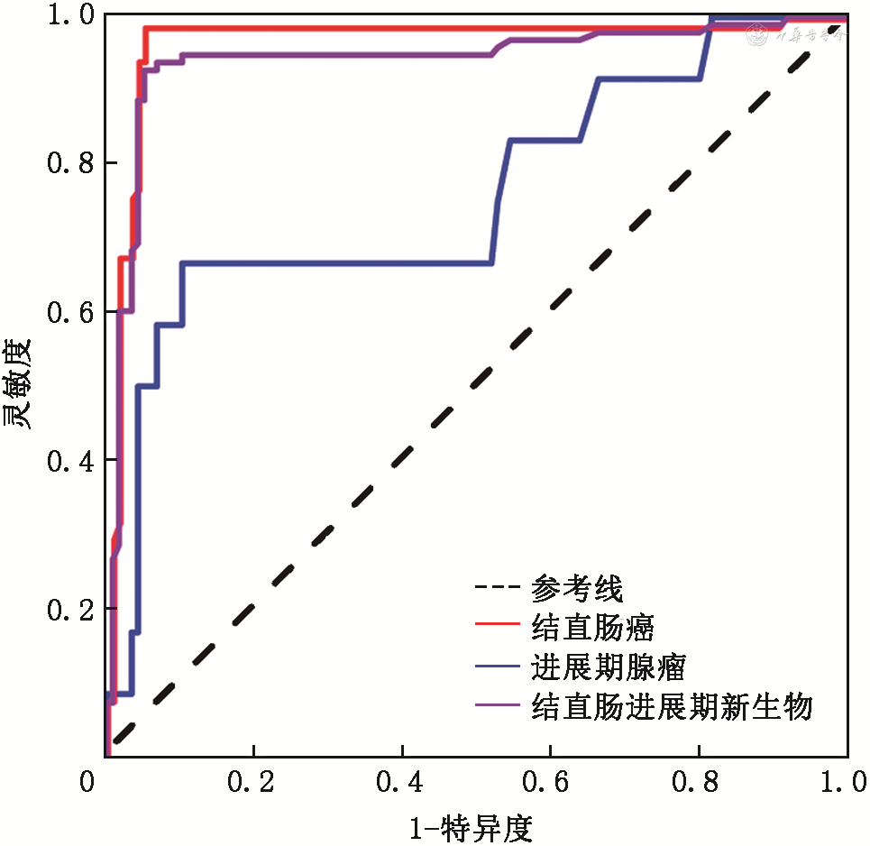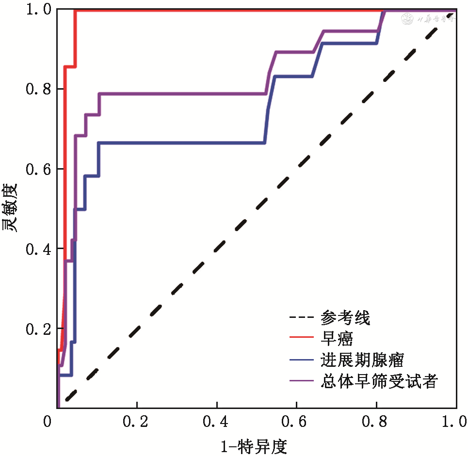 采用IBM SPSS 26.0软件进行数据分析。计数资料以频数及百分率表示。以结直肠镜或病理活检结果为金标准,采用受试者工作特征(receiver operator curves,ROC)曲线评估FIT-DNA联合检测技术对CRC及进展期腺瘤的筛查和诊断效能。双侧检验,检验水准α=0.05。