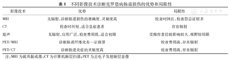 MRI、超声和CT在检测肠道狭窄和肠瘘的形态学方面具有同样高的准确度。T2WI快速采集弛豫增强序列在诊断肠道狭窄方面甚至比T1WI增强扫描更具优势;MTI、UEI和18F-FDG PET/MRI在诊断肠道纤维化方面均表现出较高效能;MRI和CT均为检测腹腔脓肿的首选技术;MRI和AES诊断肛周病变的准确度都很高。不同影像技术诊断克罗恩病肠道损伤的优势和局限性见表1[30]。