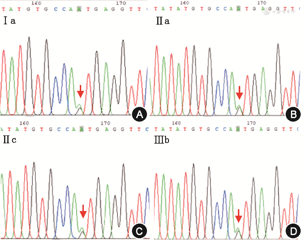 2. 基因突变筛选和Sanger测序结果:首先对小家族(Ⅱa、Ⅱd、Ⅲa、Ⅲb)的外周血DNA进行WES。自动筛选后,仍有1 357个候选变异需要进一步筛选。基于半自动突变筛查和解释,共发现86个染色体显性遗传变异与患者心血管系统损害相关。根据临床表现,发现Ⅱa和Ⅲb FBN1基因杂合突变c.6806 T>C(p.Ile2269Thr),此突变已被确定为与心血管系统损害患者表型相关的候选致病突变。该突变是FBN1基因位于第56外显子的错义突变位点,导致处于该位置的异亮氨酸被苏氨酸取代(p.Ile2269Thr)。检索HGMD发现FBN1基因突变是MFS已知的致病性突变[14],但FBN1基因c.6806 T>C国内尚未见报道。其后,使用Sanger测序验证其余家族成员。在另一位先证者Ⅰa和Ⅱc中发现该杂合突变位点(图3)。此外,MutationTaster和SIFT软件预测FBN1中的c.6806 T>C是致病的,并与疾病表型密切相关。