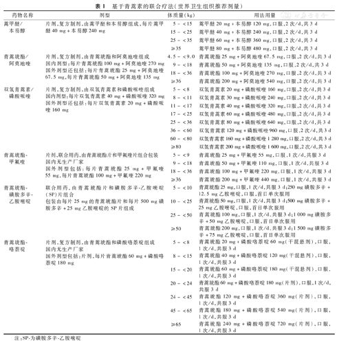 | 青蒿琥酯-磺胺多辛-乙胺嘧啶 | 联合用药,由青蒿琥酯片和磺胺多辛-乙胺嘧啶(SP)片组合包装由每片25 mg的青蒿琥酯片和每片500 mg磺胺多辛+25 mg乙胺嘧啶的SP片组成 | 5~<10 | 青蒿琥酯25 mg,口服,1次/d,共服3 d;250 mg磺胺多辛+12.5 mg乙胺嘧啶,口服,首日单次服用 |