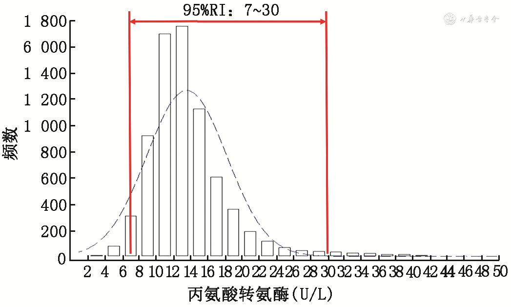 2. RI制定的方法学流程:一般情况下,大家会遵循CLSI发布的参考区间制定流程[5]来建立适用于本地区人群的参考区间,我们完成的中国儿童参考区间研究也严格遵循了该方法学流程,包括:(1)定义健康参考个体:健康参考个体(尤其是儿童或老年人)的定义与测量并没有达成共识的标准,在设计参考个体的纳入与排除标准时,一般考虑将明确影响临床实验室检测结果的因素和生物学变异来源作为参考个体的排除标准,排除有明确影响因素(如1周内有服药史、手术史或输血史等)和生物学变异来源(如患有先天遗传代谢疾病)的个体后,获得相对的表观健康个体作为参考个体。(2)确定是要制定全国范围内通用的参考区间,还是为某地区的临床实验室建立参考区间,如果是前者,需要考虑通过多中心招募参考个体。(3)计算样本量:CLSI建议每个分组内建立参考区间的样本量不少于120例。在针对具体的临床实验室化验指标制定参考区间时,需要事先判断这些指标是否存在年龄依赖趋势、性别差异、地区差异等,如果存在,需要明确是否需要划分不同亚组制定参考区间。然后采用以下公式估算最小样本量:n=120×2(2个性别分组)×m(m个年龄分组)×o(o个地区分组)。(4)设计健康参考个体的筛查流程:一般会通过问卷调查(主要针对影响因素)、健康体检以及临床实验室检查来逐步筛出表观健康的参考个体。(5)制定标准操作规程(standard operating procedure,SOP):包括健康个体筛查,血标本采集、处理及转运,实验室分析,数据管理及统计分析等关键实施环节的SOP,以及针对参考个体的分析前、分析中及分析后质量控制手册。(6)基于SOP培训相关研究人员,保证研究人员参照SOP标准化实施研究,确保数据真实、可溯源。(7)数据清洗与统计分析:获得参考值后,进行数据清洗,然后实施统计分析。详细步骤包括:确定是否需要按年龄、性别划分亚组[7];在划分好的亚组内采用统计学方法识别离群值,对离群值产生原因进行分析,然后确定是否保留离群值;绘制频数分布图,采用非参数法估计RI上限值和下限值及其90%CI,(下限值,上限值)即为RI(图1)。(8)RI适用性验证:RI区间建立后,需要对其在其他临床实验室的适用性进行评价,一般按照制定RI时设计的研究对象纳入标准筛选年龄与性别匹配的研究对象,≥20例,将其化验值与RI进行比对,如果落在RI外的化验值所占比例≤10%,则视为适用,否则不适用。如果不是由于人群差异导致的,则需要进一步评估临床实验室质量,改进后再次开展评估。反之,需要考虑制定适用于本实验室覆盖人群的RI。