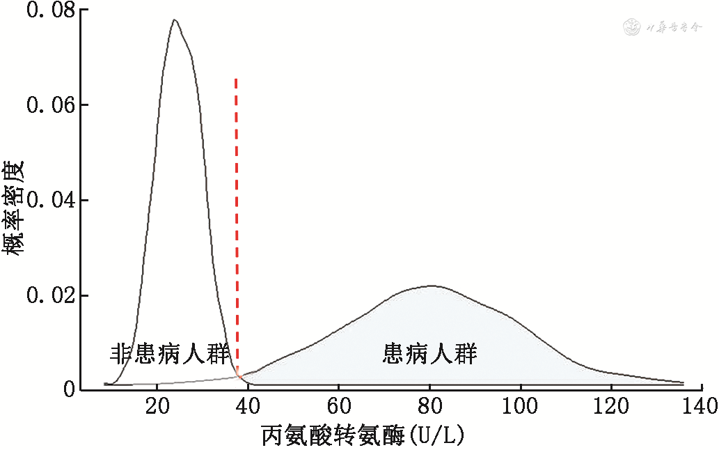 (1)诊断截点值的建立:如何确定诊断截点值,取决于该诊断截点值对应的结局指标。针对类似肿瘤标志物诊断截点值的相关研究,常常遵循以下步骤[10]:①以明确诊断肿瘤患者为病例组,基线可比的健康人为对照组,比较两组人群的肿瘤标志物表达水平是否存在差异,尤其是病例组测量值分布范围与对照组无重叠时,高度提示该标志物有潜在诊断价值;②在临床门诊连续纳入疑似患者,测量肿瘤标志物,同时随访每一位患者的金标准诊断结果,然后通过绘制受试者工作特征(receiver operating characteristic,ROC)曲线确定诊断截点值,如果在该诊断截点值下获得的灵敏度与特异度有临床意义,则开展下一步研究对其诊断准确性进行评估;③依然在临床门诊连续纳入疑似患者,测量肿瘤标志物,采用上一步建立的诊断截点值进行诊断,将基于肿瘤标志物的诊断结果与金标准诊断结果进行对比,计算灵敏度、特异度、阳性和阴性预测值等指标,对该肿瘤标志物的诊断准确性及其诊断截点值的适用性进行评价。诊断截点值一般会权衡灵敏度与特异度的临床意义,取患病人群与非患病人群的频数分布图的交叉点(图2)。