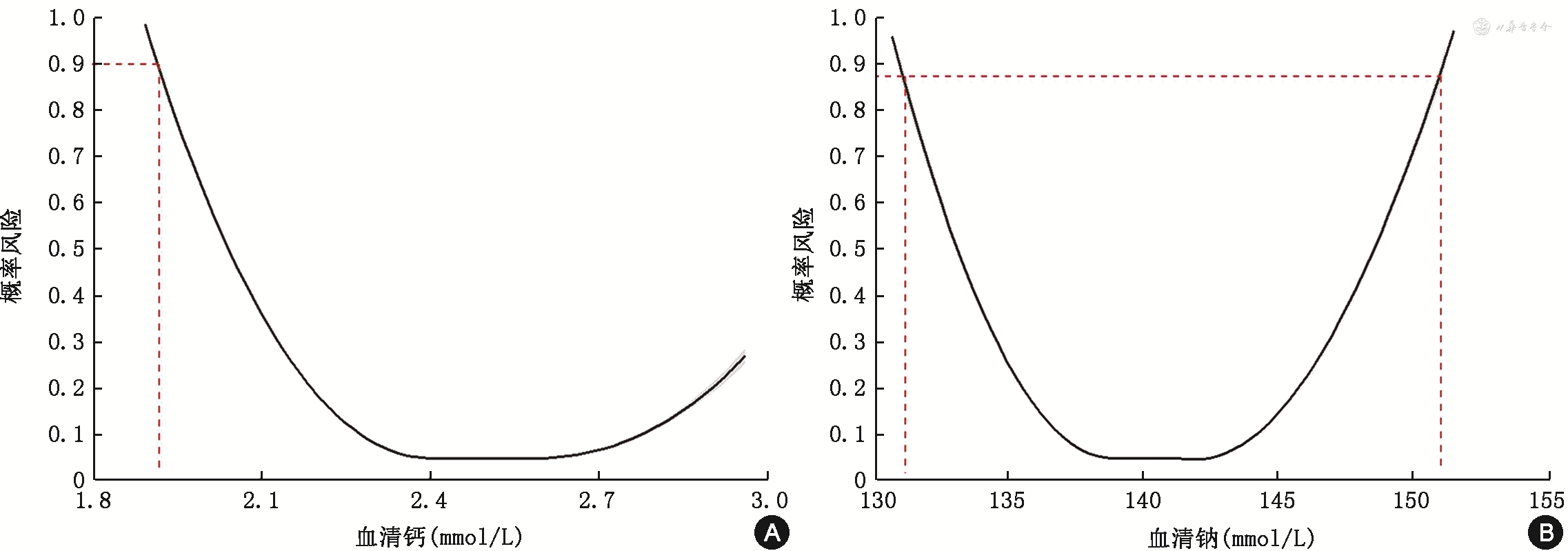 注:虚线为血清钙和血清钠水平对应的不良临床结局发生风险