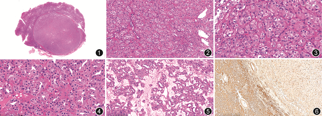 病理检查:送检左肾灰黄肿物1枚,大小1.5 cm×1.3 cm×1.4 cm,切面灰黄色、实性、界清。镜下观察:肿瘤边界清楚(图1),肿瘤细胞呈管状或巢状排列。肿瘤中心区域存在低细胞密度区,其间质疏松水肿。肿瘤细胞呈多角形,胞质絮状嗜酸性,有散在的胞质内空泡,细胞核圆形,核形规则,染色质呈细颗粒状,观察全部肿瘤区域,低倍镜下未见到清晰的核仁[WHO/国际泌尿病理协会(ISUP)2级,图2, 3, 4, 5]。间质存在肥大细胞(图1)。免疫组织化学:肿瘤细胞PAX8,肾脏特异性抗原(kidney-specific cadherin,Ksp-cadherin)、SDHB、广谱细胞角蛋白(CKpan)、E-cadherin、波形蛋白、P504s呈弥漫阳性,CD10、TFE3、TFEB、细胞角蛋白(CK)7、CD117、碳酸酐酸Ⅸ(CAⅨ)呈阴性表达。肿瘤组织中FH阴性,正常肾组织FH阳性表达(图6)。间质肥大细胞CD117阳性。送检右肾肿物一枚,大小2.4 cm×1.5 cm×1.5 cm,切面多彩状。镜下观察:肿瘤细胞呈巢状排列,胞质透明,间质见纤细的纤维血管网,核分级为WHO/ISUP 2级。免疫组织化学:肿瘤细胞PAX8、CD10、CAⅨ、CKpan、波形蛋白阳性表达,TFE3、CD117、CK7阴性。双侧肾肿瘤均未见凝固性坏死及血管侵犯,pTNM分期均为T1aN0M0。分子检测:包括425个基因的下一代测序(NGS)结果证实,左肾肿瘤的FH突变类型为体细胞错义突变(c.1256C>T,p.5419L)。
