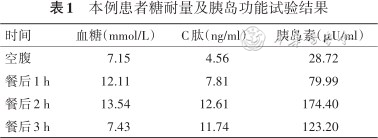 | 时间 | 血糖(mmol/L) | C肽(ng/ml) | 胰岛素(μU/ml) |