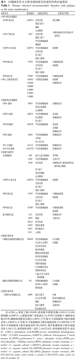 原发性遗传性神经递质代谢紊乱相关癫痫,癫痫表型多样,从轻微表型到严重的早发性癫痫性脑病不等,以癫痫发作为主要表现的原发性遗传性神经递质病的主要临床特征见表1[3]。