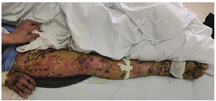 入院体检:体温36.8 ℃,呼吸20次/min,脉搏65次/min,血压130/75 mmHg(1 mmHg=0.133 kPa)。贫血貌,皮肤巩膜轻度黄染,全身浅表淋巴结未触及肿大;双肺呼吸音清,未闻及明显干湿性啰音;心率65次/min,未闻及病理性杂音;全腹软,右侧胁肋部可见一长约10 cm弧形手术疤痕,愈合可,肝脾肋下未触及;双下肢凹陷性水肿。皮肤科检查:全身弥漫性皮疹(颜面部、四肢及胸腹部均可见)、水疱,水疱大小不一,有破溃,伴渗血及渗液,部分破溃结痂(图1);口腔黏膜多处溃疡,四肢散在棕色色素沉着。实验室检查:白细胞计数12.9×109/L,中性粒细胞计数10.3×109/L,中性粒细胞0.80,血红蛋白81 g/L,C反应蛋白73 mg/L;血清白蛋白28.9 g/L,总胆红素60.5 μmol/L,直接胆红素46.1 μmol/L,间接胆红素14.4 μmol/L,丙氨酸转氨酶55 U/L;甲胎蛋白48.4 μg/L;纤维蛋白原4.33 g/L。肾功能、电解质检查和其他肿瘤相关指标均未见异常。腹部CT检查结果示肝脏恶性肿瘤术后,肝脏多发转移瘤(首先考虑),后腹膜淋巴结转移瘤。胸部CT、心电图、超声心动图、双下肢动静脉超声检查均未见异常。诊断:药疹(可能为信迪利单抗诱发),肝细胞性肝癌术后,低蛋白血症,肝功能不全。建议患者行皮肤组织活检明确药疹类型,但患者及家属拒绝。