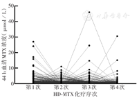 242例ALL患儿共完成962例次HD-MTX化疗,各次MTX给药44 h血清MTX浓度范围为0.11~46.08 µmol/L,中位浓度0.45 µmol/L(0.33 µmol/L,0.72 µmol/L)。MTX排泄延迟总发生率为17.7%(170/962),轻、中、重度排泄延迟发生率分别为13.8%(133/962)、2.6%(25/962)、1.2%(12/962)。每例患儿历次HD-MTX给药44 h血清MTX浓度变化情况见图1,Friedman检验结果显示,患儿历次HD-MTX化疗间44 h血清MTX浓度的差异有统计学意义(Z=10.23,P=0.017)。