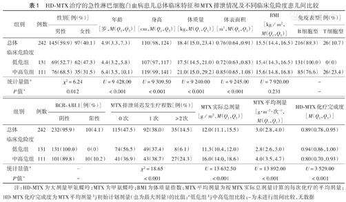 HD-MTX治疗的急性淋巴细胞白血病患儿总体临床特征和MTX排泄情况及不同临床危险度患儿间比较