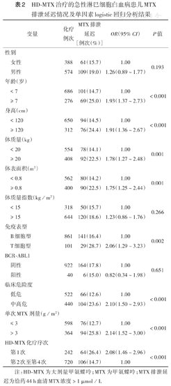 HD-MTX治疗的急性淋巴细胞白血病患儿MTX排泄延迟情况及单因素logistic回归分析结果