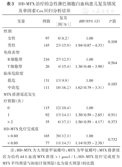 HD-MTX治疗的急性淋巴细胞白血病患儿复发情况及单因素Cox回归分析结果