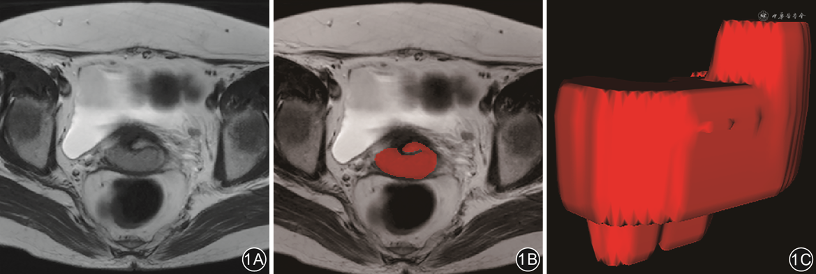 采用Achieva 3.0 T MR扫描仪(Philips Healthcare,荷兰),8通道体部相控阵线圈。患者在检查前至少禁食4 h,扫描开始前适量饮水保持膀胱充盈。扫描参数如下。(1)标准快速自旋回波T2WI(矢状位、冠状位及横断位):TR 3 000 ms,TE 80 ms,翻转角90°,层厚5 mm,层距0.5 mm,视野30 cm×30 cm,矩阵320×260,激励次数2。(2)使用单次平面回波成像序列在横断面上行常规DWI,b值为0、800 s/mm2,TR 3 500 ms,TE 55 ms,翻转角90°,层厚5 mm,层距0.5 mm,视野32 cm×32 cm,矩阵132×128,激励次数2。表观弥散系数(apparent diffusion coefficient,ADC)图像采用单指数模型,由2个b值的DWI数据自动生成。(3)静脉注射对比剂钆喷酸葡胺(剂量0.1 mmol/kg)后行增强T1WI(cT1WI)序列(矢状位、冠状位及横断位):TR 600 ms,TE 20 ms,视野30 cm×26 cm,层厚5 mm,层距0.5 mm,矩阵352×366,激励次数2。