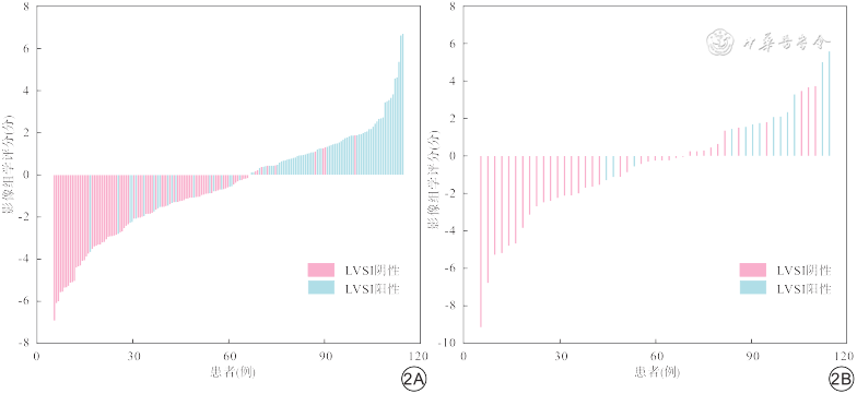 注:影像组学评分>0分为预测淋巴脉管间隙浸润(LVSI)阳性,<0分为预测LVSI阴性