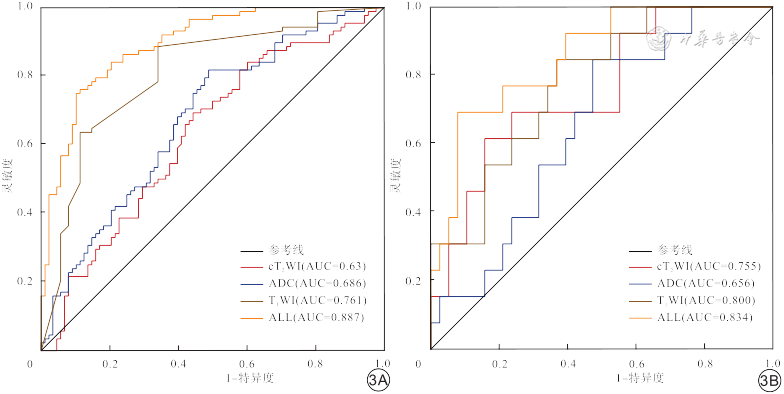 本研究中,基于多参数MRI所提取的影像组学特征,包括一阶直方图特征、形态学特征、纹理特征及小波特征,其中筛选出用于构建影像组学模型的关键特征均为LoG转换、小波变换等高阶特征。究其原因:一方面,可能是由于LoG滤波器可以平滑图像,降低其对噪声的灵敏度,并增强纹理细节,以提高捕获与肿瘤异质性相关特征的效率[12];另一方面,小波变换作为一种滤波算法,通过变换进一步突出肿瘤的局部状态信息,测量整个肿瘤体积的变异性,特别是能提供不同频段上的信息,从而量化肿瘤的异质性,这与之前的研究结果一致[23,25]。并且,我们逐层勾画出肿瘤全体积VOI,较单一层面ROI,更为稳定地反映肿瘤异质性。