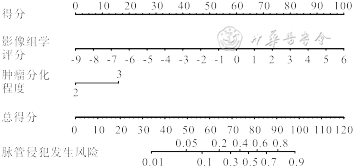 影像组学评分=-1.262 4×T2_wavelet.LHL_firstorder_RobustMeanAbsoluteDeviation+1.143 9×T1_log.sigma.1.0.mm.3D_firstorder_Kurtosis-0.712 4×T1_lbp.3D.m1_firstorder_Skewness+2.095 5×ADC_wavelet.LHL_gldm_LargeDependenceHighGrayLevelEmphasis-2.572 9×ADC_wavelet.HLL_glrlm_LongRunHighGrayLevelEmphasis+1.576 0×T1_log.sigma.3.0.mm.3D_glrlm_GrayLevelNonUniformity-0.850 3×T1_wavelet.HHL_glszm_GrayLevelNonUniformity-0.107 3