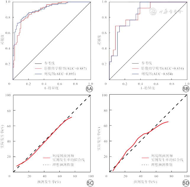 单因素与多因素logistic回归分析显示肿瘤分化程度是宫颈癌LVSI的独立预测因子,联合影像组学模型,通过多因素logistic回归建立融合模型,并构建列线图(图4),对应的AUC在训练集中为0.893(95%CI 0.851~0.929),灵敏度、特异度、准确度分别为0.739、0.898、0.818,优于影像组学模型(图5A、5B),在验证集中进行验证,所得AUC为0.854(95%CI 0.749~0.943),灵敏度、特异度、准确度分别为0.692、0.842、0.804。结果表明,融合模型对宫颈癌LVSI预测效能最佳。采用校正曲线(图5C、5D)来评估列线图的校正性能,在训练集与验证集中均显示出良好的一致性。通过Hosmer-Lemeshow检验来分析拟合度,P值分别为0.695、0.877,表明未偏离拟合。