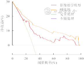 DCA曲线图显示,阈值概率范围在0.50~0.96之间时模型的净收益最大,即在这个范围内,使用该列线图预测宫颈癌LVSI状态的临床应用价值大于影像组学模型,并且上述两种模型的获益均优于“将所有宫颈癌患者都看作LVSI阴性”或“将所有宫颈癌患者都看作LVSI阳性”。见图6。