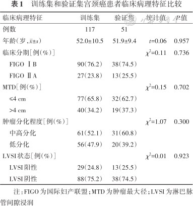 回顾性研究。纳入2016年6月—2019年3月山西省肿瘤医院接受根治性子宫切除术联合盆腔淋巴结清扫术的宫颈鳞癌患者168例。以7∶3的比例按照随机抽样法分为训练集117例和验证集51例。记录患者的临床病理资料,包括年龄、FIGO分期、肿瘤最大径(maximum tumor diameter,MTD)、肿瘤分化程度、LVSI状态等。