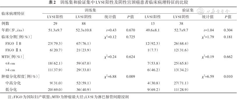 训练集和验证集中LVSI阳性及阴性宫颈癌患者临床病理特征的比较