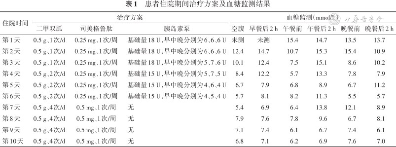患者 男,47岁。主因“发现血糖升高6个月,口干、多饮10 d”入院。患者6个月前体检发现血糖升高,空腹血糖10 mmol/L,患者未予重视,饮食、运动控制不严格,未就诊治疗,未系统监测血糖。10 d前,患者出现口干、多饮症状,无多食易饥,尿量约1 500~2 000 ml/d,无明显体重变化。10 d来,患者单纯通过控制饮食及适当运动控制血糖,未应用药物,自行监测空腹血糖波动于12~15 mmol/L,餐后血糖未监测,为进一步诊治就诊我院门诊。查空腹血糖15.3 mmol/L,糖化血红蛋白(glycated hemoglobin A1c,HbA1c)10.4%,尿白蛋白/肌酐比值15.3 mg/g,收入石家庄市中医院内分泌一科。近6个月来,患者偶有乏力,无视物模糊,无恶心、呕吐,无四肢手套、袜套样改变,无间歇性跛行,无双下肢水肿,尿中无泡沫,二便大致正常,体重无明显下降。既往史:脂肪肝、高脂血症病史多年,未应用药物治疗,近期未复查。否认手术、外伤史,否认食物及药物过敏史。吸烟史30年,约20支/d,饮酒史30年,现每月约饮酒1~2次,饮酒量每次不足50 g。父亲有高血压、冠心病病史,母亲有糖尿病病史。入院查体:身高165.0 cm,体重90.7 kg,体重指数33.3 kg/m2,腰围114 cm,臀围124.5 cm。生命体征平稳。神志清楚,精神可。体型肥胖,浅表淋巴结无肿大。双侧肢体深浅感觉对称存在。入院后查空腹C肽3.7 ng/ml,胰岛素24.08 μU/ml,空腹血糖16.2 mmol/L,胰岛细胞抗体、胰岛素自身抗体及谷氨酸脱羧酶抗体均为阴性,血酮体0.1 mmol/L,尿酮阴性,尿糖3+,血浆胆固醇4.99 mmol/L,甘油三酯3.58 mmol/L,低密度脂蛋白胆固醇3.77 mmol/L,高密度脂蛋白胆固醇0.82 mmol/L。患者为中年男性,病史较短,数次监测空腹血糖≥7.0 mmol/L,HbA1c≥6.5%,糖尿病诊断明确。患者体型肥胖,有糖尿病家族史,无自发酮症酸中毒倾向,考虑2型糖尿病可能性大。患者发病时间短,入院后查血糖水平高,空腹C肽及胰岛素水平处于参考值正常范围内,糖尿病相关抗体检查结果回报为阴性,除外1型糖尿病及成人隐匿性自身免疫糖尿病的诊断。患者既往无腹部手术、无胰腺炎症及肿瘤性疾病、甲状腺疾病、肾上腺疾病等其他内分泌疾病病史,无激素等特殊用药史,无新型冠状病毒等病毒感染病史,故不考虑其余病因导致的特殊类型糖尿病。故患者2型糖尿病诊断明确。入院后予司美格鲁肽0.25 mg、1次/周皮下注射,二甲双胍0.5 g、3次/d口服,联合胰岛素泵强化治疗,调节全天基础量为24.4 U(0∶00—4∶00用量为0.5 U/h,4:00—9∶00用量为1.5 U/h,9:00—17∶00用量为1.0 U/h,17:00—21∶00用量为1.2 U/h,21:00—24∶00用量为0.7 U/h),三餐前分别给予8 U餐时量皮下注射,根据血糖调节降糖药物用量,患者血糖水平逐渐下降,撤除胰岛素泵前,司美格鲁肽应用剂量为0.25 mg,1次/周皮下注射,二甲双胍0.5 g,2次/d口服,胰岛素泵全天基础量为12.2 U(0∶00—4∶00用量为0.25 U/h,4:00—9∶00用量为0.75 U/h,9:00—17∶00用量为0.5 U/h,17:00—21∶00用量为 0.6 U/h,21:00—24∶00用量为0.35 U/h),三餐前分别给予5 U餐时量皮下注射。患者空腹血糖控制于5~6 mmol/L,餐后血糖控制于7~10 mmol/L。患者平素工作繁忙,且工作环境复杂,反复强调每日注射治疗方案无法依从,可依从周制剂注射药物治疗或口服药物治疗;故调整降糖方案为司美格鲁肽0.5 mg、1次/周皮下注射,二甲双胍0.5 g、3次/d口服治疗,无明显恶心、腹胀、腹泻、便秘等消化系统症状,患者血糖控制满意(表1),遵医嘱出院。出院后患者门诊随诊,并根据血糖调整降糖方案。3个月后,患者应用司美格鲁肽1.0 mg、1次/周皮下注射。因患者合并心血管疾病,给予二甲双胍、恩格列净改善预后并较单用二甲双胍减少服药次数,提高依从性。复查空腹C肽3.5 ng/ml,胰岛素20.08 μU/ml,空腹血糖6.6 mmol/L,HbA1c 7.0%,血浆总胆固醇3.99 mmol/L,甘油三酯1.46 mmol/L,低密度脂蛋白胆固醇2.37 mmol/L,高密度脂蛋白胆固醇0.92 mmol/L。自行监测血糖,空腹波动于4.5~6.7 mmol/L,餐后波动于5.5~8.9 mmol/L。体重78.5 kg,体重指数28.8 kg/m2,腰围96 cm,臀围103.5 cm。患者血糖达标,未出现低血糖,血脂、体重指数等多重心血管危险因素得到显著改善,临床效果满意。