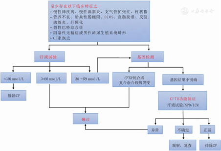 汗液试验为确诊试验。汗液氯离子浓度≥60 mmol/L可以确诊CF;如果汗液氯离子浓度<30 mmol/L可除外CF;汗液试验氯离子浓度在30~59 mmol/L之间,则需进一步通过CFTR基因检测和/或其他CFTR功能检测明确诊断。具体诊断流程见图1。